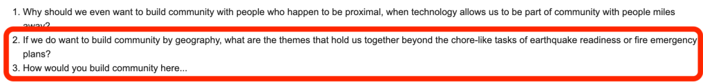 Anyhow. I would propose the goal of a community-building exercise in your new neighborhood is to set yourselves up to be exposed to the unique weirdness (or “divine shard”) of each person.